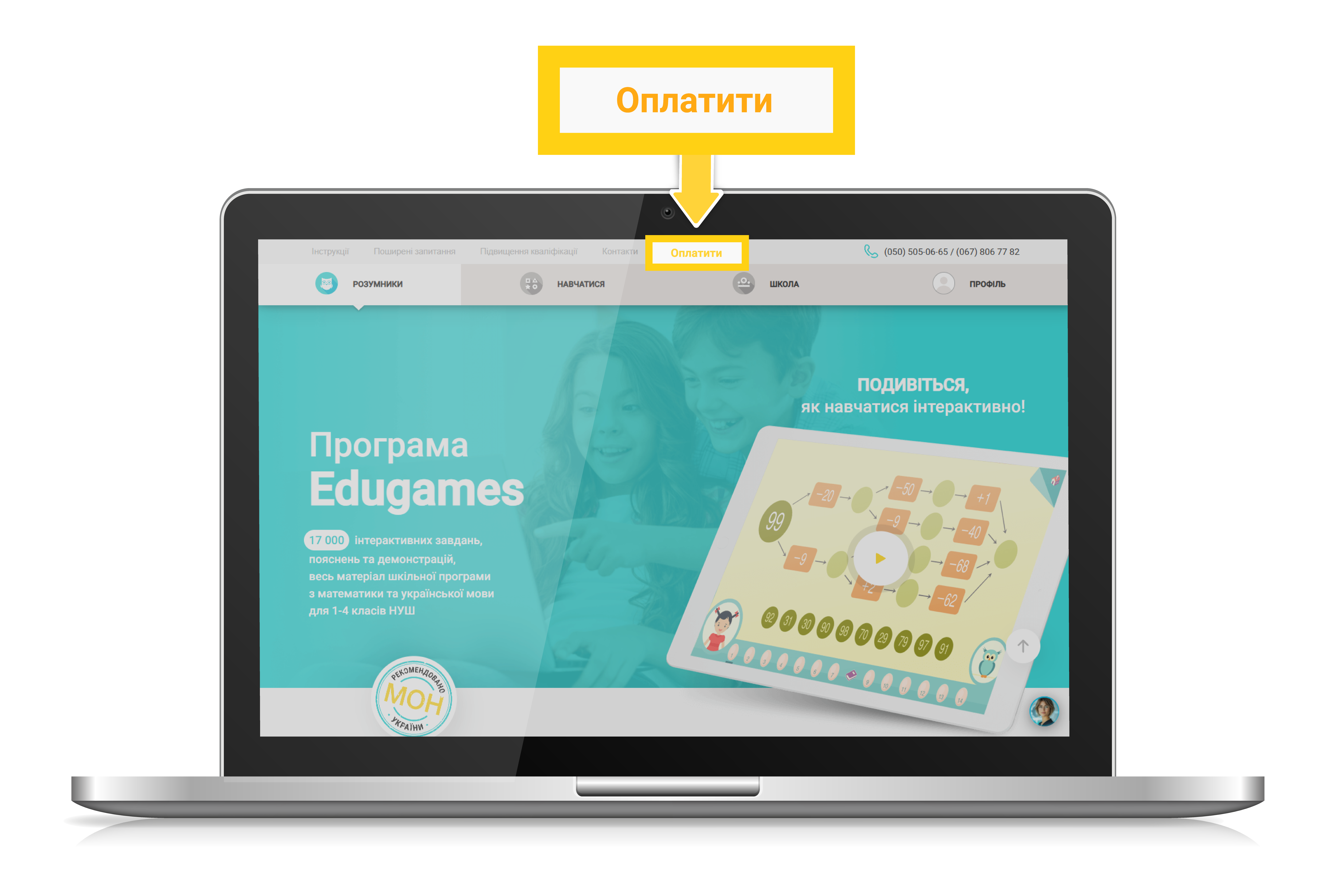 Щоб потрапити на сторінку оплати підписки, натисніть «Оплатити» у верхньому меню сайту edugames.rozumniki.com.