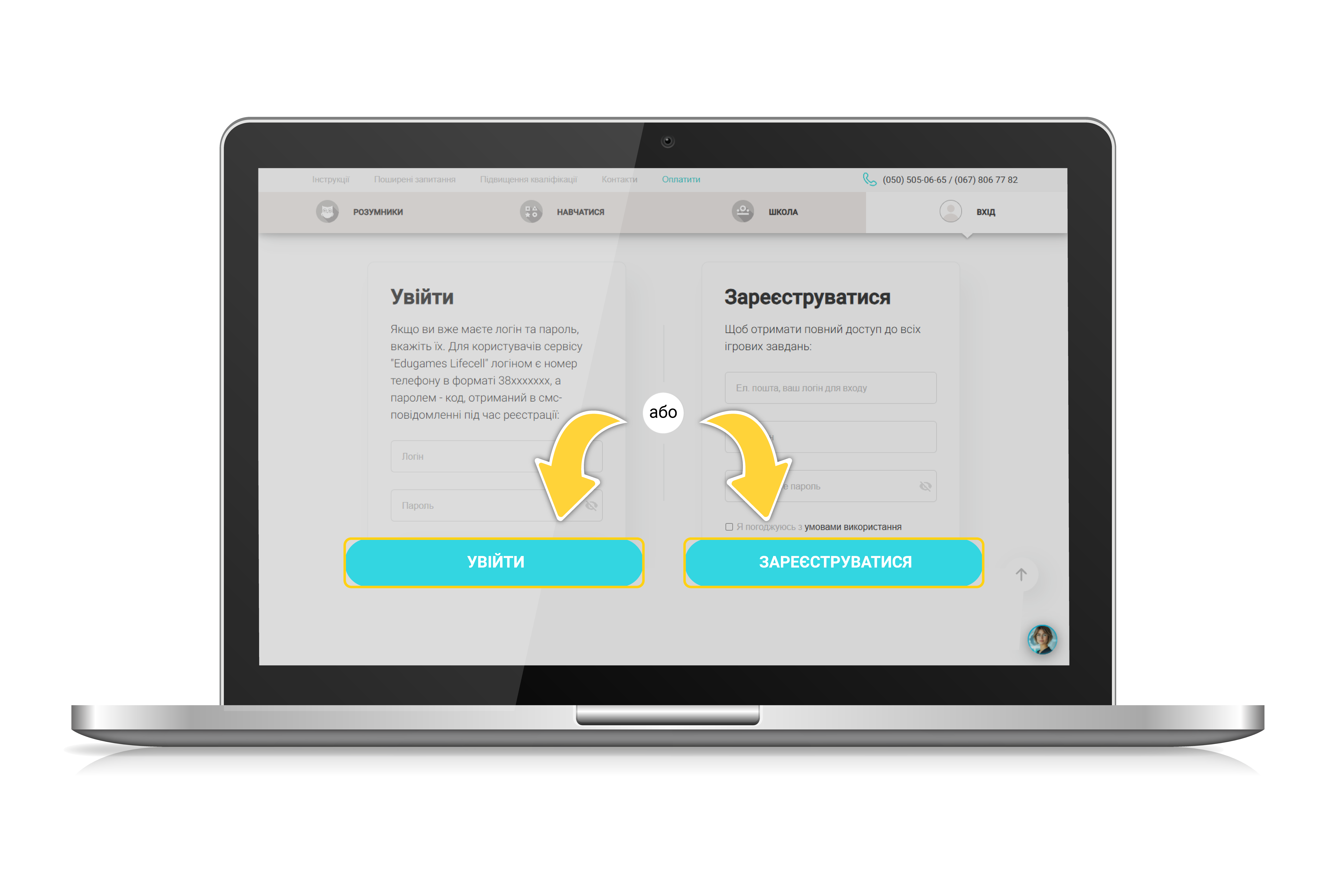 Для продовження потрібно увійти або зареєструватися. Якщо ви вже маєте вчительський логін та пароль, вкажіть їх і натисніть «Увійти». Якщо ви новий користувач (вчитель), вкажіть e-mail (уважно – після завершення реєстрації введений e-mail стане вашим логіном), придумайте пароль і натисніть «Зареєструватися».