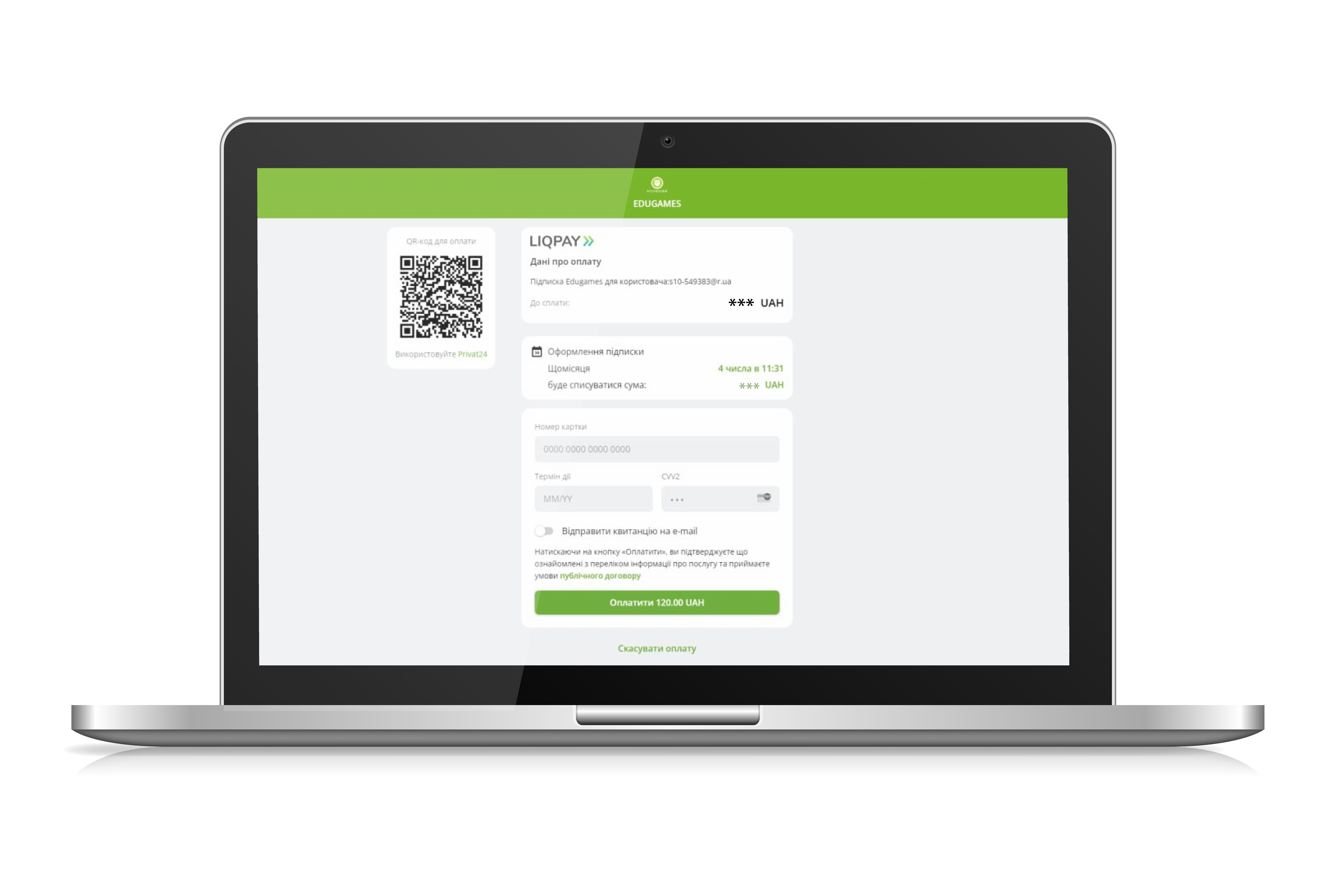 Далі на сторінці оплати виконайте стандартні операції для оплати за допомогою платіжної картки.