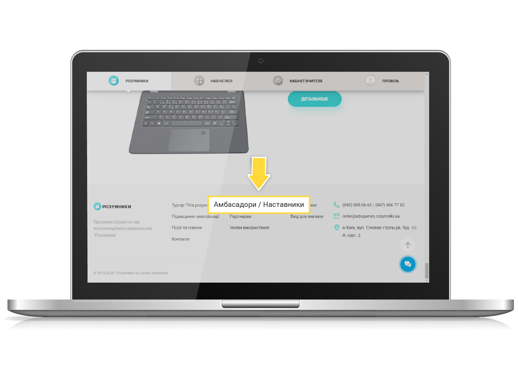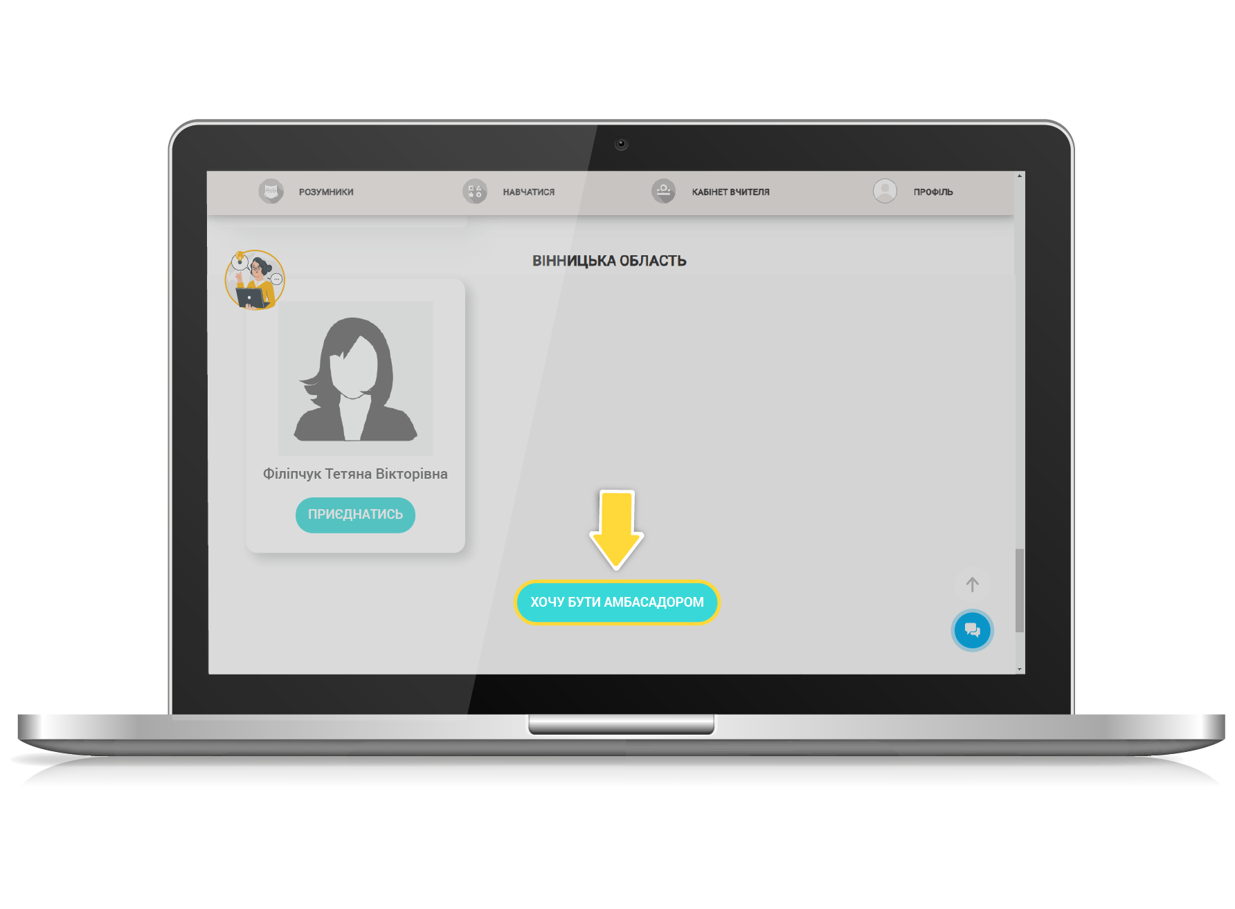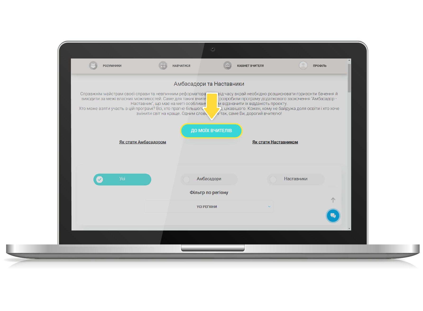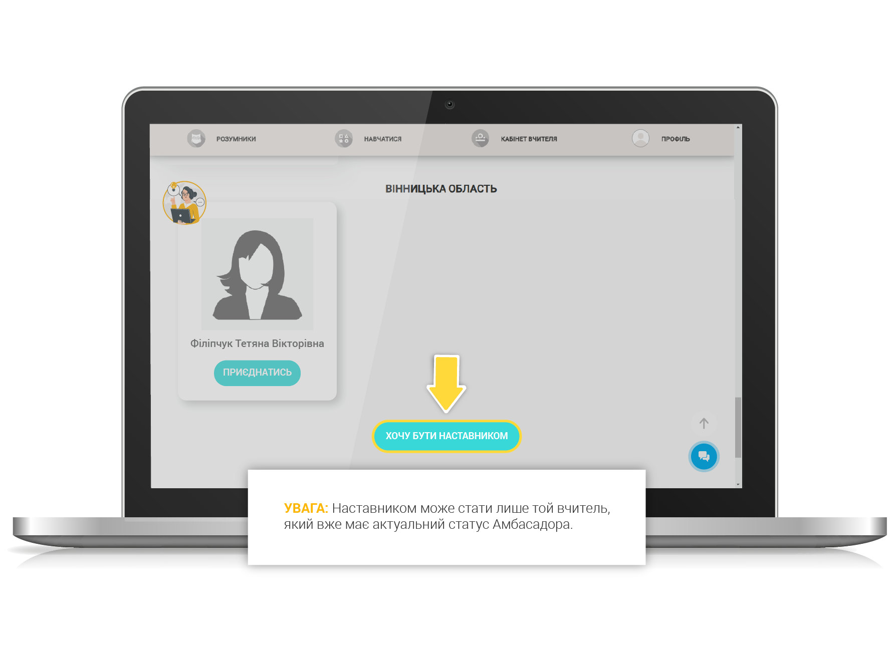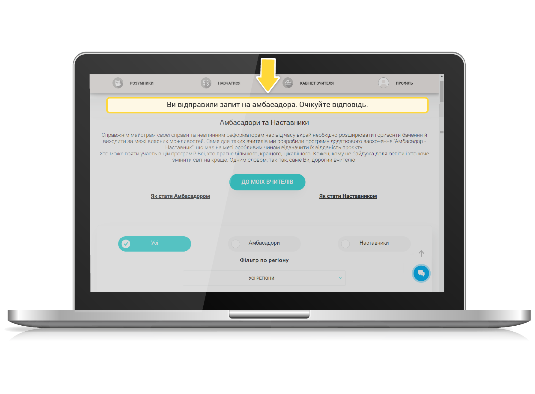 1. Для того, щоб стати Амбасадором, ОБОВ’ЯЗКОВО авторизуйтеся на сайті під логіном вчителя, заповніть усі поля у профілі вчителя (ПІБ, номер телефону, електронну пошту, назву навчального закладу), перейдіть на сторінку «Амбасадори та Наставники» за допомогою відповідної кнопки в меню (дивитись п.1 інструкції), знайдіть внизу сторінки кнопку «ХОЧУ БУТИ АМБАСАДОРОМ» і натисніть її