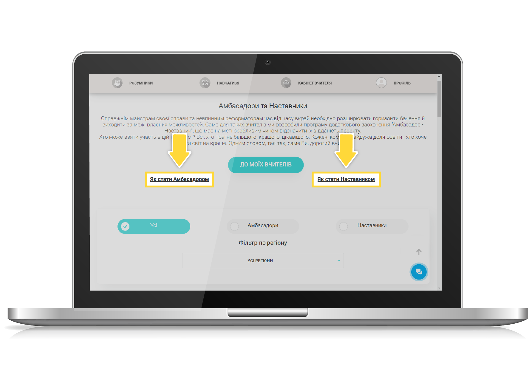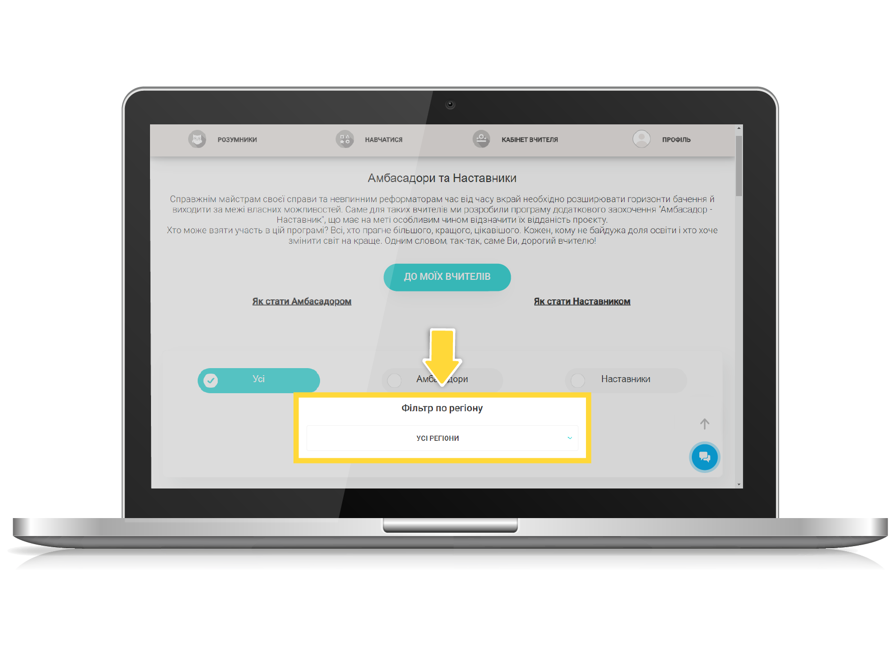На сторінці «Амбасадори та Наставники» у вас є можливість переглянути перелік актуальних Амбасадорів та Наставників , застосувавши для зручності фільтр за регіоном.