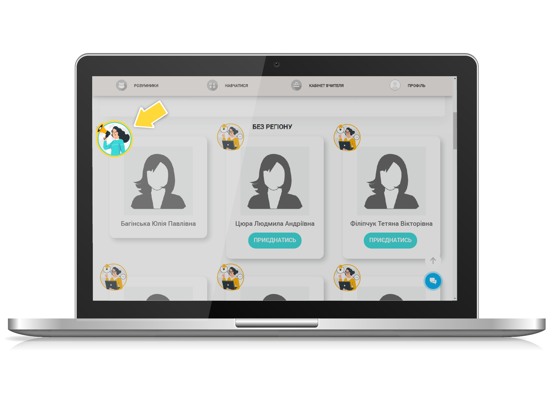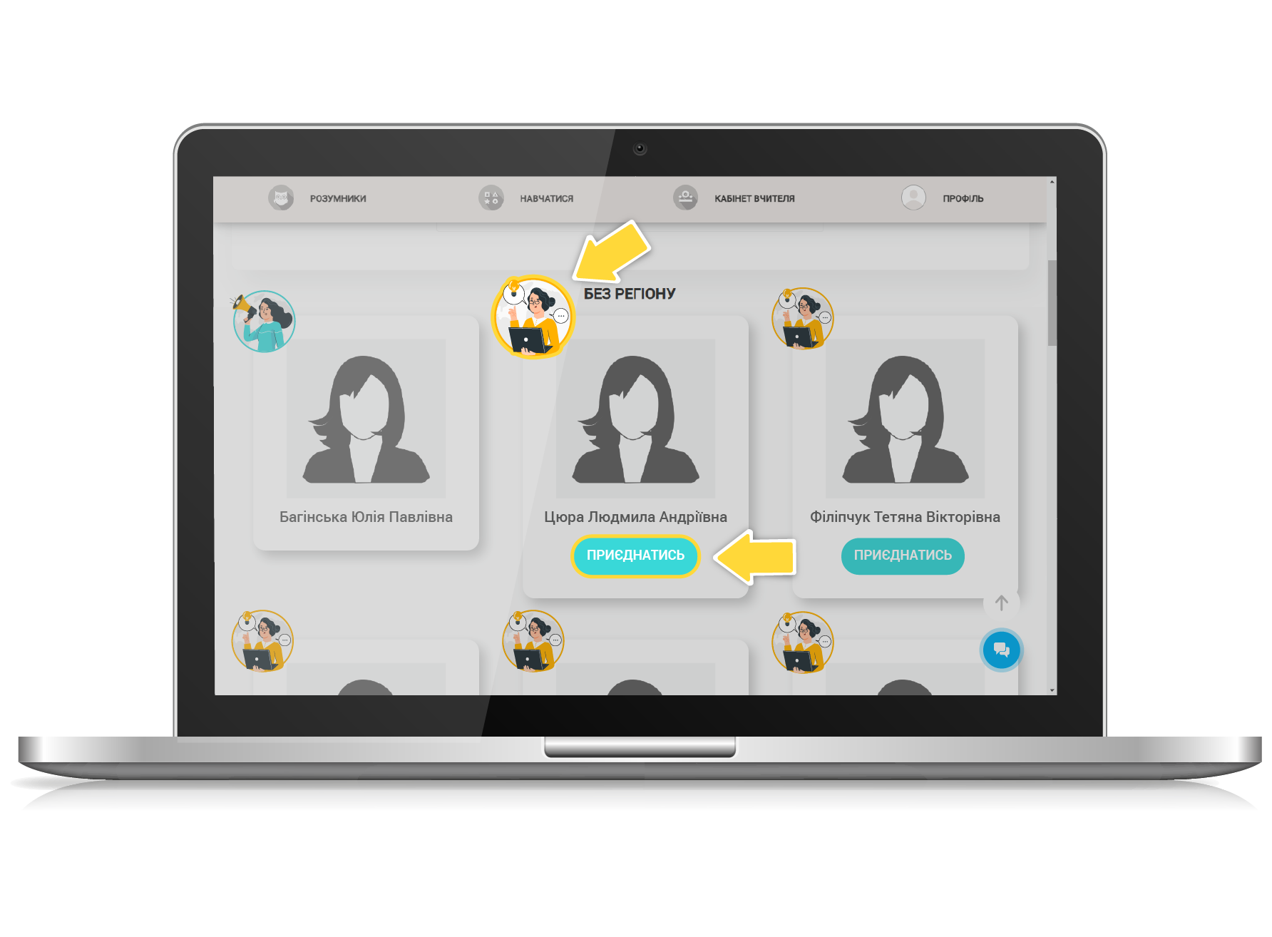 А біля фото вчителя Наставника розміщена ось така іконка та кнопка «ПРИЄДНАТИСЬ», натиснувши на яку Ви можете відправити заявку на приєднання до команди обраного наставника.